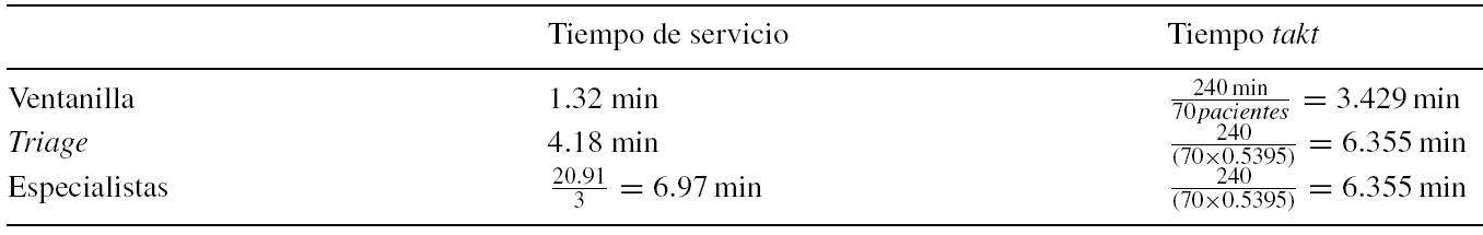 Un primer acercamiento al análisis de la capacidad y que es útil para efectos de planeación y control es obtener el tiempo necesario para atender el flujo de pacientes o tiempotakt(del alemánTaktzeit, «ritmo») y compararlo contra el tiempo de servicio de la respectiva estación: si el tiempotaktes mayor, entonces existe capacidad para atender la demanda; en caso contrario, la capacidad es insuficiente. El tiempotaktse calcula con la ecuación Dondeies el índice de la estación. En latabla 4se observa que la ventanilla y eltriagetienen la capacidad suficiente para atender la demanda; en el caso de los médicos especialistas, de la comparación se aprecia que el tiempo de servicio es 9.67% mayor, lo que se interpreta que en esta estación la demanda es mayor a la capacidad de atención. Cabe señalar que el tiempotaktsolamente indica hasta este momento que no existe capacidad. Sin embargo, esto en sí no es suficiente ni puede considerarse como una respuesta para un administrador, ya que ahora es necesario saber cómo incrementar la capacidad. Para soportar esta decisión se aplicarán las relaciones de líneas de espera de latabla 3.