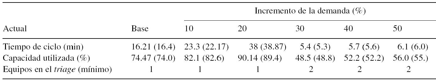 Con base en lo expuesto en el párrafo anterior, además de analizar el estado actual es necesario realizar una proyección de los requerimientos de capacidad mínimos para el sistema. Mediante incrementos de la demanda de 10% se estimó el tiempo de ciclo promedio en ambas estaciones. En lastablas 4y5se muestran los resultados deltriagey de los especialistas, y se debe señalar que se inicia con el caso base (demanda actual). Para el caso de los médicos especialistas se supone que no existe diferencia entre los médicos, por lo que la media de 20.91 min es la misma para los tres médicos.