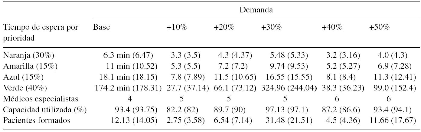 Empleando las ecuaciones de latabla 6se concluye que se requieren como mínimo 4 médicos para atender la demanda base, y cabe señalar que el área de especialistas se encontrará con una elevada congestión, donde los pacientes de menor prioridad son los que deberán en promedio esperar más tiempo a ser atendidos. El tiempo de respuesta promedio será alrededor de 6 min para los niveles de urgencia más altos (tabla 6).