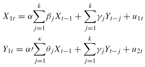 En el caso bivariado, suponiendo una causalidad entre 2 variables y que cada ecuación contiene k valores rezagados, se puede estimar cada ecuación por mínimos cuadrados ordinarios de la siguiente forma: Donde las uit son los términos de error, conocidos como impulsos, innovaciones o shocks.