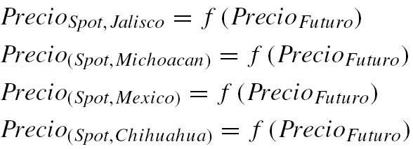En esta investigación se examinó la dinámica de la volatilidad entre el precio empleado como cobertura por los productores de maíz blanco mexicanos y el realmente registrado en el país. Es así que se analizan 4 precios spot de maíz blanco provenientes de los Estados de Jalisco, México, Michoacán y Chihuahua, y un precio originario del CBOT el cual es, para maíz amarillo, calidad US#2.