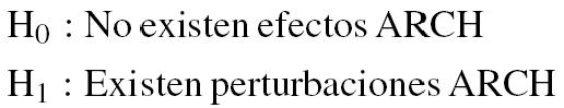 Posteriormente, fue necesario comprobar la presencia de efectos ARCH sobre las series, por lo que se aplicó el contraste de heterocedasticidad LM-ARCH a los residuos de las estimaciones ARMA, el cual tiene como hipótesis: