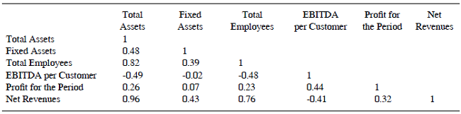 Previous studies outlined the input and output variables: Total Asset (Kassai, 2002); Fixed Assets (Chiu, Huang & Ma, 2011); Total of Employees (Çelen, 2013; Chiu, Huang & Ma, 2011), Profit (Saurin, Miranda and Costa Junior, 2010), Net Income (Chiu, Huang & Ma, 2011), EBITDA per customer (Anjos, Bordin and Melo 2010, Saurin, Miranda and Costa Junior, 2010). The results do not suggest collinearity in relations between input variables x input or product x product, which would signal the unviability of their use (Table 1).