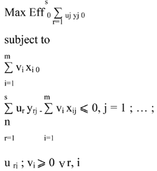 In this model, vi and ur are respectively input i , i =1, ... , m , and output r, r =1, ... , s, multipliers; xij and yrj are DMU j, j =1, ... , n inputs i and outputs r; xi0 and yr0 are DMU 0 inputs i and outputs r.