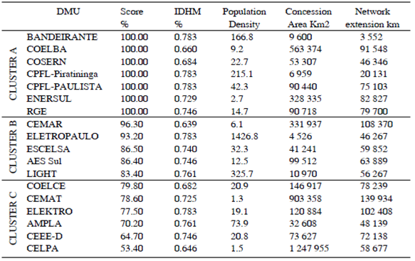 The study includes the analysis of technical efficiency on 18 electrical energy distributors. The DEA methodology considers only the efficient units that reached a 100% score. The companies were grouped in three clusters: Cluster A, companies with 100% score; Cluster B, companies with a score from 80% to 99.9%; Cluster C, companies scored below 80%. Seven companies have achieved the efficient frontier: BANDEIRANTE, COELBA, COSERN, CPFL-Piratininga, CPFL-Paulista, ENERSUL and RGE. The other companies were considered inefficient, and the score ranges from 53.4% to 96.3%. Table 2 shows the scores of the units analyzed.