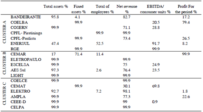 Over the variables that most contributed to the achievement of efficiency, in cluster C, the variables that most contributed to the efficiency are Total Assets and Net Revenue, except CEMAT where the Total Employees and EBITDA Consumer Units are the variables that contributed, as can be seen in Table 3.