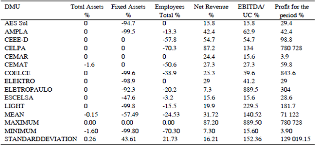 The variables selected as outputs were: Profit (profit or loss), Net Income: corresponds to gross revenues of the entity, from sales of goods or goods and services, minus the sales returns and canceled, the discounts granted unconditionally and taxes and contributions levied on sales and EBITDA per customer (representing the company's operating profit, disregarding financial income or expense). Anjos, Bordin and Mello (2010) argue that the use of the ratio EBITDA/ number of customers is more advisable than the use of isolated variable number of customers because companies with a larger number of customers are likely to have higher EBITDA.