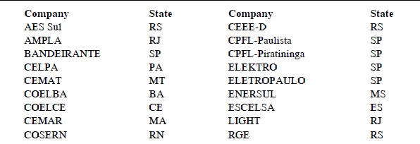 Data were collected in the database of the BM&FBOVESPA, on the site www.bmfbovespa.com.br/Cias-Listadas/Empresas-listadas/BuscaEmpresaListada.aspx?segmento=Energia+Eletrica&Idioma=pt-br and through ANEEL’s site (http://www.aneel.gov.br/), between May and June of 2013.