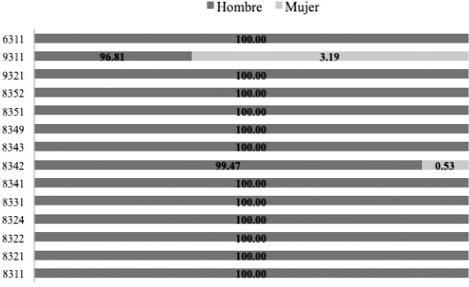 El panorama cambia para el año de 2012, pues la participación de la mujer incrementó pasando del 0.35% registrado en 1996 a 13.43% de los trabajadores en este sector. La Figura 2 muestra de manera detallada el grado de participación por género y por grupo unitario; se observa que el grupo unitario 9311 (Ayudantes de conductor de transporte terrestre con motor) incrementó la participación de la mujer de manera significativa pues su participación pasó de 3.19% a un 61.06% de los ocupados en este grupo, así mismo el grupo 8342 (Conductores de autobuses, camiones, camionetas, taxis y automóviles de pasajeros) pasó de 0.53 a 16.47% de participación de la mujer. Además de estos dos grupos unitarios, fueron seis más los que registraron participación de la mujer: el grupo 6311 (Operadores de maquinaria agropecuaria y forestal) con el 8.38%; el grupo 9321 (Conductores de vehículos de transporte en bicicleta) con el 16.99%; el grupo 8352 (Conductores de maquinaria móvil para el movimiento de mercancías en fábricas, puertos, comercio, etc.) con el 6.32%; el grupo 8351 (Conductores de maquinaria móvil para la construcción y minería) con el 4.38%; el grupo 8341 (Conductores de camiones y automóviles de carga) con el 9.90%; y finalmente el grupo 8321 (Capitanes y conductores de transporte marítimo) con el 22.23%.