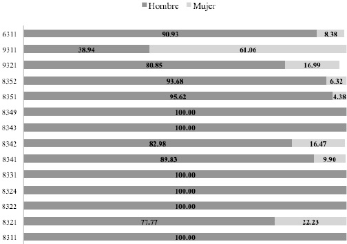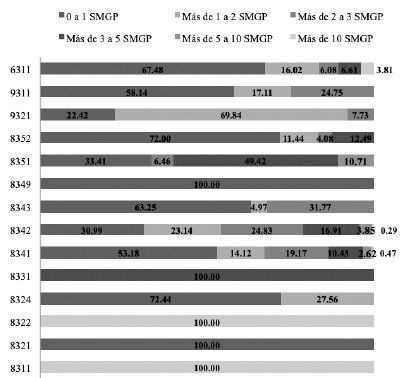 Finalmente, la Figura 6 muestra el nivel de ingresos de los trabajadores en 2012, clasificado en 6 categorías de Salario Mínimo General Promedio (SMGP), se observa que la mayoría de los trabajadores obtiene de 0 a 1 SMGP; solo tres grupos unitarios obtienen más de 10 SMGP: 6311 (Operadores de maquinaria agropecuaria y forestal) con el 3.81%; y los grupos 8322 (Oficiales y marineros de cubierta y prácticos) y 8311 (Pilotos de aviación) con el 100%.