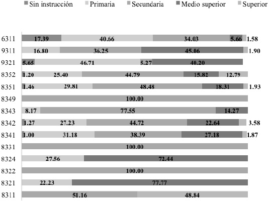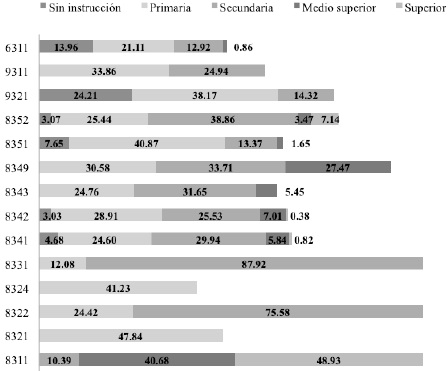 Para el año 2012, los niveles de instrucción formal para los trabajadores de este grupo mostraron cambios, la Figura 4 muestra que el nivel de escolaridad que predomina es el de secundaria, seguido por el nivel medio superior; en este periodo se suman a los cuatro grupos con estudios de nivel superior tres más: el grupo 6311 (Operadores de maquinaria agropecuaria y forestal) con 1.58%, el grupo 9311 (Ayudantes de conductor de transporte terrestre con motor) con 1.90%, y el grupo 8351 (Conductores de maquinaria móvil para la construcción y minería) con 1.93%.