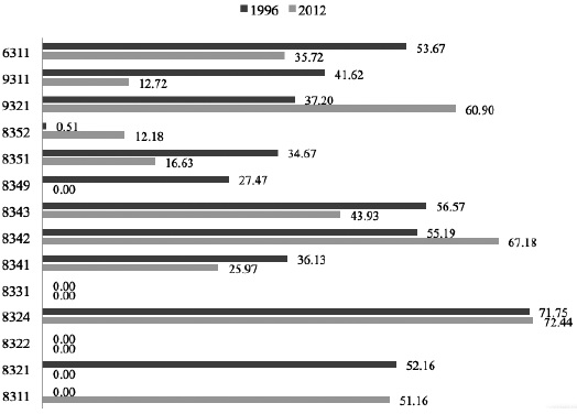 Respecto a las condiciones laborales, éstas fueron medidas respecto a si tenían o no prestaciones provenientes de su trabajo, la Figura 5 muestra que un porcentaje considerable de los trabajadores de este grupo no tiene prestaciones. Para el año 1996 solo tres grupos principales tenían el 100% de sus trabajadores prestaciones: el grupo 8311 (Pilotos de aviación), el grupo 8322 (Oficiales y marineros de cubierta y prácticos) y el grupo 8331 (Conductores de transporte en vías férreas). El grupo más precario fue el grupo 8324 (Conductores de pequeñas embarcaciones) pues el 71.75% de sus trabajadores no tenían prestaciones. Para el año 2012 la situación no cambia mucho pues si bien hubo dos grupos más que tuvieron mejores condiciones por tener prestaciones: los grupos 8321 (Capitanes y conductores de transporte marítimo) y 8349 (Otros conductores de transporte terrestre con motor no clasificados anteriormente); el grupo 8311 tuvo un retroceso pues de contar anteriormente con el 100% de sus trabajadores con prestaciones para el año 2012 solo el 48.84% se sus trabajadores tenían prestaciones.