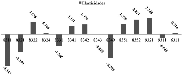 La Figura 7 muestra el resultado del cálculo de las elasticidades para el periodo 1996-2012 de los “Conductores de transporte y de maquinaria móvil” a nivel nacional; se observa que de los 14 grupos, 5 presentaron elasticidades negativas. El grupo que presentó la elasticidad más alta fue el 9321 (Conductores de vehículos de transporte en bicicleta) con un valor de 2.248, esto pudiera deberse al incremento que hubo por la implementación de programas en este tipo de vehículos. Por otra parte, el grupo unitario con la elasticidad más baja fue el 8311 (Pilotos de aviación) con un valor de -4.343, lo cual pudiera deberse a la crisis que se enfrentó en 2010 por parte de la aerolínea Mexicana de Aviación la cual suspendió operaciones para después declararse en quiebra. Otra de las conclusiones a las que llegan Ríos y Carrillo (2014) y que coincide con el resultado de la Figura 7, es que las elasticidades positivas corresponden en buena medida al empleo no calificado, en este caso los grupos unitarios que presentaron elasticidades positivas en su mayoría tienen un grado de escolaridad de nivel secundaria. Nuevamente, el caso del grupo 8311, coincide con lo que Kato (2004) refiere sobre los incrementos en el desempleo, lo cual lo atribuye a una disminución del valor obtenido en la elasticidad producto del empleo, pues este grupo tuvo una valor en su elasticidad de -4.343, pasando de 1.01 a 0.07% de su población ocupada en el periodo de 1996-2012, conclusión similar aunque se traten de sectores distintos de la economía mexicana, pues Kato se refiere a las elasticidad producto del empleo en la industria manufacturera y aquí se trata sobre el sector transporte en México.