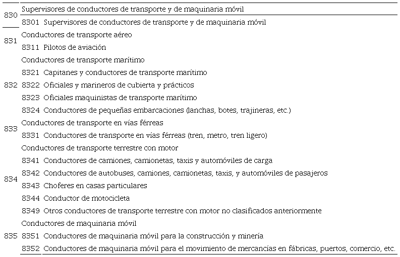 La información que se presenta en la Tabla 1 se basa en los criterios utilizados en la CUO, el grupo 83 está formado por 6 subgrupos (tres dígitos) y 14 grupos unitarios (4 dígitos). Adicionalmente a este grupo, para efectos de este trabajo se están considerando tres grupos unitarios más, pues éstos se encontraban dentro de este grupo en la anterior clasificación los cuales se considera importante no dejarlos fuera en este análisis. Los grupos unitarios son los siguientes: 6311 Operadores de maquinaria agropecuaria y forestal, 9311 Ayudantes de conductor de transporte terrestre con motor, y 9321 Conductores de vehículos de transporte en bicicleta.
