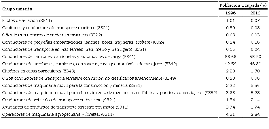 La Tabla 2 muestra la participación de la población ocupada en el grupo: “Conductores de transporte y de maquinaria móvil”. Se observa que para el año 2012 dos fueron los grupos unitarios con más trabajadores dentro de este grupo: el 46.80% de los ocupados fueron los conductores de autobuses, camiones, camionetas, taxis y automóviles de pasajeros; y el 35.90% de los ocupados fueron conductores de camiones, camionetas y automóviles de carga. Estos dos grupos unitarios representan aproximadamente el 82% de los ocupados en este grupo.