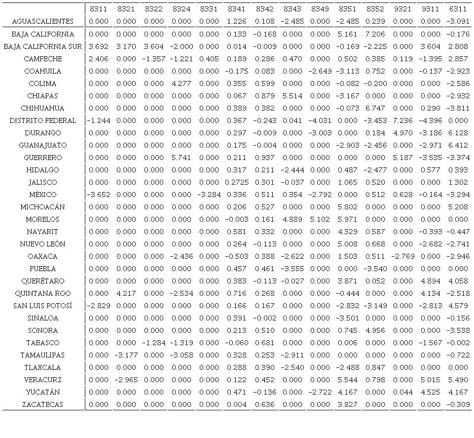 Hubo estados en los que las actividades registraron elasticidades con valores negativos por lo que la participación de su PEAO registró valores muy bajos; y por el contrario hubo actividades en las que se registraron elasticidades con valores positivos reflejándose en un incremento de la participación de su PEAO en 16 años. Las entidades federativas que tuvieron una mayor participación de la PEAO en este grupo principal fueron: México, Veracruz, Distrito Federal, Jalisco, Michoacán, Nuevo León y Puebla; por otra parte, las entidades federativas con menor participación de se PEAO fueron: Baja California Sur, Colima, Campeche, Tlaxcala, Aguascalientes y Zacatecas.