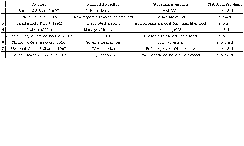 Given the problems with the use of traditional econometric methods in the analysis of social network data, current knowledge about the diffusion of managerial practices may be seriously compromised. The statistically significant results found in the papers presents in this paper may very well be insignificant using the SAOM since it overcomes many of the limitations of traditional econometric models. Future research should take into account appropriate statistical tests when dealing with social network data in order to decrease the risk of erroneous estimations.