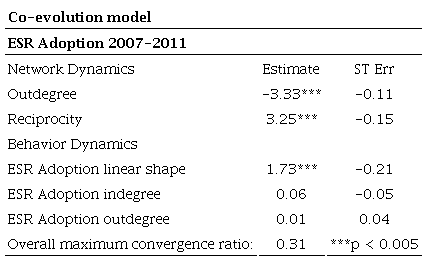 Table 1 also presents results for the adoption of the ESR certification, the behavior in this example. The estimate of indegree and outdegree with 0.06 and 0.01 respectively, indicates the influence in the ESR adoption over time. In this example, however, there is no significant effect. This means that board interlocks do not influence the adoption of the ESR certification during the 2007-2011. However, the linear shape expresses a rise in the number of adopters between waves. In other words, CSR adoption is increasingly contagious within the network of board interlocks, however this contagiousness is not caused by the ties in the network. Direct contact, represented by the indegree and outdegree or number of interlocks that a firm is not significant.