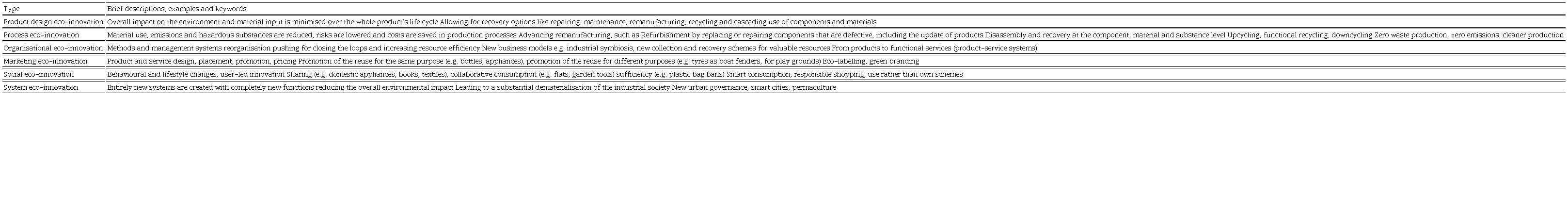 The role of eco-innovations to foster the transition towards Circular Economy has been sparsely researched. Eco-innovations with the potential to enable the transition to a resource-efficient circular economy model include efforts to change dominant business models (from novel product and service design to reconfigured value chains), transform the way citizens interact with products and services (ownership, leasing, sharing, etc.) and develop improved systems for delivering value (sustainable cities, green mobility, smart energy systems, etc.) (Eco-Innovation Observatory, 2016 p. 11).