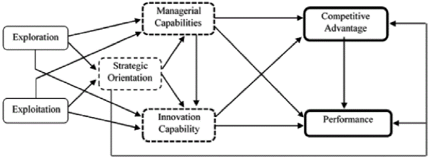 The relationship between the concepts of organizational ambidexterity and dynamic capabilities remains relatively unexplored. A better understanding of this relationship is necessary to comprehend the effect it has on firm performance. This paper makes several contributions to the theories of dynamic capabilities and organizational ambidexterity. It has been confirmed that dynamic capabilities have no direct impact on firm competitive advantage. Several researchers (Eisenhardt and Martin, 2000; Helfat, 1997; Liu et al. 2014; Teece et al., 1997; Teece, 2007) analysed dynamic capabilities’ impact on firm competitive advantage. Each of these studies, though using different variables, indicate that the relation between dynamic capabilities and firm competitive advantage is indirect. Accordingly, it is necessary to identify strategic orientation and managerial and innovation capabilities that can have a mediating effect on this relation. Thus, previous studies (He and Wong, 2004; Jansen et al., 2006) have confirmed innovations to be a source of competitive advantage.