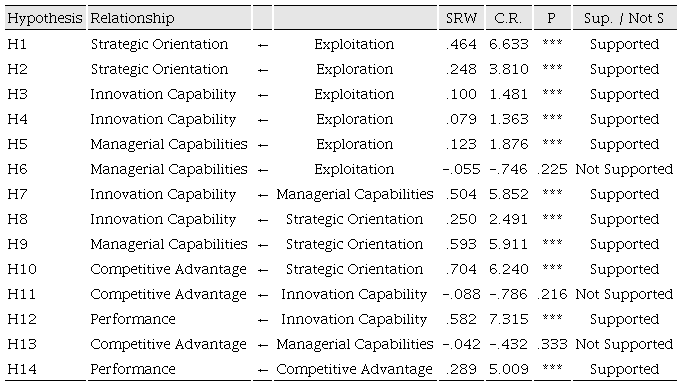 Resumen: Este estudio emplea una perspectiva de las capacidades dinámicas (en adelante DC) para examinar las relaciones entre la orientación estratégica (SO), la capacidad de innovación (IC), las capacidades de gestión (MC) y las capacidades de exploración y explotación, sobre la ventaja competitiva (CA) y el desempeño de la empresa. Este estudio propone que el papel de las capacidades de exploración y explotación en estas relaciones difiere entre las tres dimensiones de la orientación estratégica (estrategias basadas en los costos de liderazgo y estrategias basadas en la diferenciación y estrategias de producto/mercado) y el desempeño. Se utilizó el análisis de ecuaciones estructurales para testar las hipótesis en una muestra de 387 PYME portuguesas. Los resultados empíricos indican que la capacidad de innovación, las capacidades de gestión y la orientación estratégica median positivamente la relación entre las capacidades de exploración y explotación y el desempeño, mientras que la orientación estratégica afecta la ventaja competitiva y el desempeño. Finalmente, el estudio proporciona una discusión sobre las implicaciones teóricas y de gestión y las direcciones para futuras investigaciones.