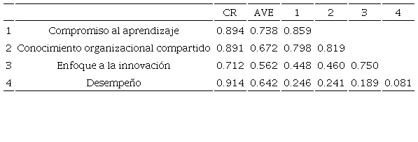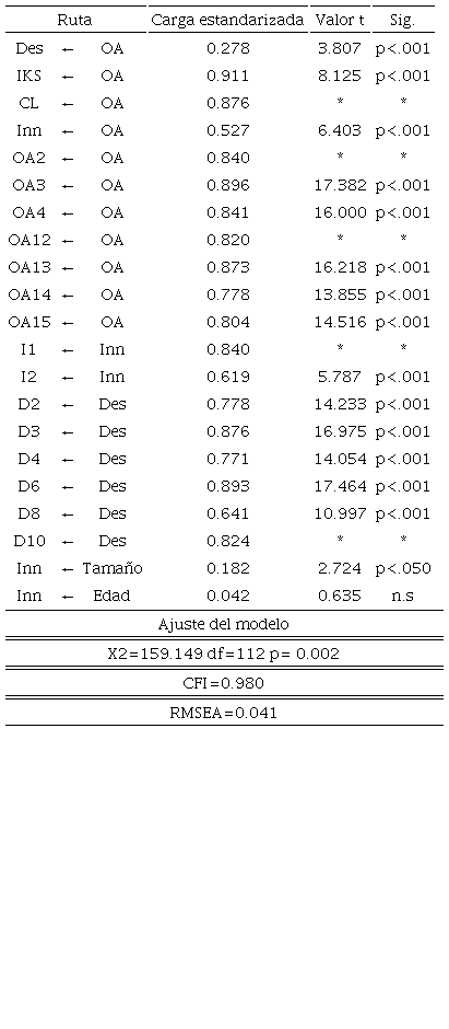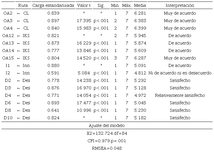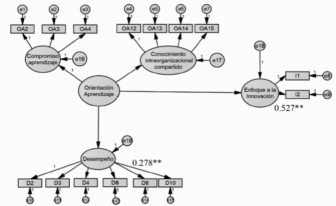 Para los constructos de orientación al aprendizaje, enfoque a la innovación y desempeño, los ítems y las cargas estandarizadas se especifican en la tabla 4. Podemos observar que todas ellas son significativas al nivel p<.001, y superiores a 0.5, lo que indica que las variables latentes están significativamente representadas por sus respectivas variables observadas. Del constructo orientación al aprendizaje los ítems OA1, OA5, OA6, OA7, OA8, OA9, OA10 y OA11 fueron eliminados por tener cargas estandarizadas menores a 0.5. y en algunos casos por ser redundantes -por lo que quedaron únicamente representadas las dimensiones de compromiso al aprendizaje y conocimiento intra-organizacional compartido-. Por las mismas razones, en el caso del desempeño también se eliminaron los ítems D1, D5, D7 y D9.