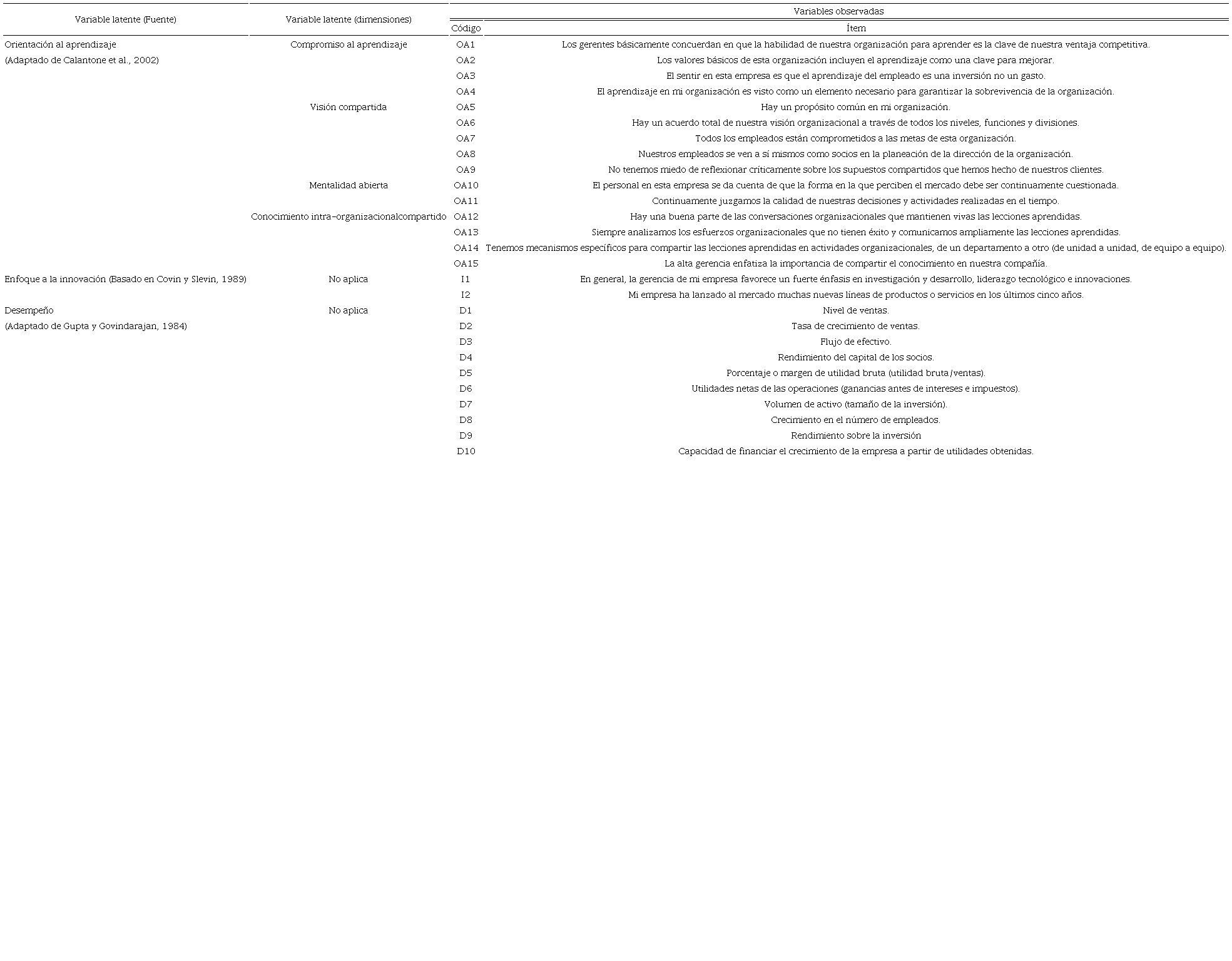 El alcance de la investigación es descriptivo y causal. Las variables incluidas en el modelo y en el cuestionario son tres. Para medir la orientación al aprendizaje se adaptó el cuestionario de Calantone et al. (2002). En el caso del enfoque a la innovación, se utilizaron dos ítems basados en Covin y Slevin (1989). La sección del desempeño en el cuestionario incluyó diez ítems los cuales buscan determinar en qué medida el desempeño de la empresa es satisfactorio y fueron adaptados de Gupta y Govindarajan (1984); estos autores, en su estudio de pequeñas empresas, eligieron medidas subjetivas del desempeño por la falta de disposición de este sector empresarial a divulgar información financiera. En la tabla 1 se identifican las variables latentes, orientación al aprendizaje y sus dimensiones, enfoque a la innovación, y desempeño. Las variables observadas son los ítems que fueron codificados para una mejor identificación.