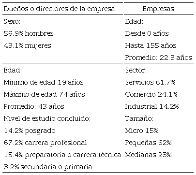 El total de empresas que participaron en el estudio fue de 253: de las cuales, el 14.2% pertenecía al sector industrial -principalmente a la industria manufacturera y de la construcción-, el 24.1% al comercio, y el 61.7% al sector de servicios -en orden de importancia, restaurantes y servicios de alojamiento, servicios de educación, servicios diversos, servicios profesionales, transportes, comunicaciones y servicios médicos-. Por el número de trabajadores, el 15% de las empresas de la muestra eran micro, el 62% pequeñas y el 23% fueron medianas. En cuanto a la edad, el 37.5% tenía hasta 15 años en el mercado, el 42.7% entre 16 y 30 años, y el resto (19.8%) más de 30 años.