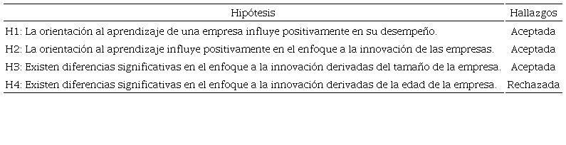 Finalmente, a modo de resumen, los hallazgos permiten afirmar que se encontró evidencia empírica a favor de la relación positiva entre orientación al aprendizaje y desempeño y también con la innovación; además, esta última se ve influenciada por el tamaño, pero no por la edad de la empresa (ver tabla 6).