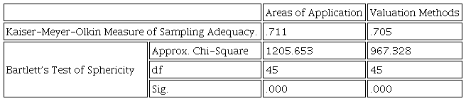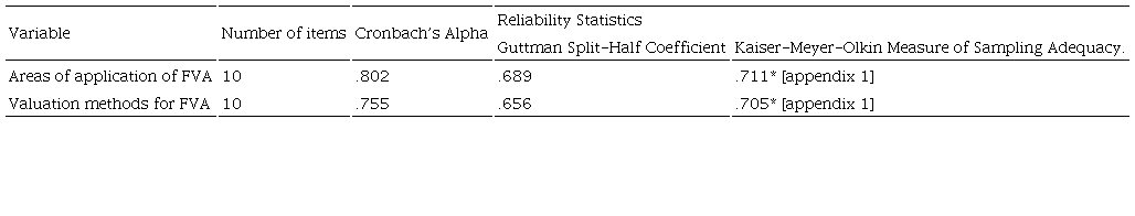 To ensure validity, the research instrument was constructed after an extensive review of extant literature. The initial draft of the questionnaire was submitted to a senior academic with competence in fair value accounting (FVA) and two senior auditors (1 from big 4 and another from a non-big 4 audit firm) specialising in fair value audit for critiquing. Feedbacks obtained from the three experts were used to refine the final version that was administered. The reliability of the research instrument was assessed using three measures of internal consistency-Cronbach’s alpha, Guttman Split-Half Coefficient, and Kaiser-Meyer-Olkin (KMO) Measure of Sampling Adequacy (Table 1). The coefficients of the Kaiser-Meyer-Olkin Measure of Sampling Adequacy (in Appendix 1) are 0.711 and 0.705 for Areas of Application and Valuation Methods respectively, both significant at 1%.