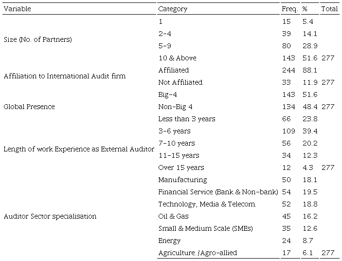 The questionnaire had two sections (A and B). Section A was subdivided into two sub-sections A1 and A2. Subsection A1 measured audit firm attributes such as size, affiliation to international audit firm, and global presence. Subsection A2 elicited data on respondent’s profile (work experience and sector of audit specialisation).