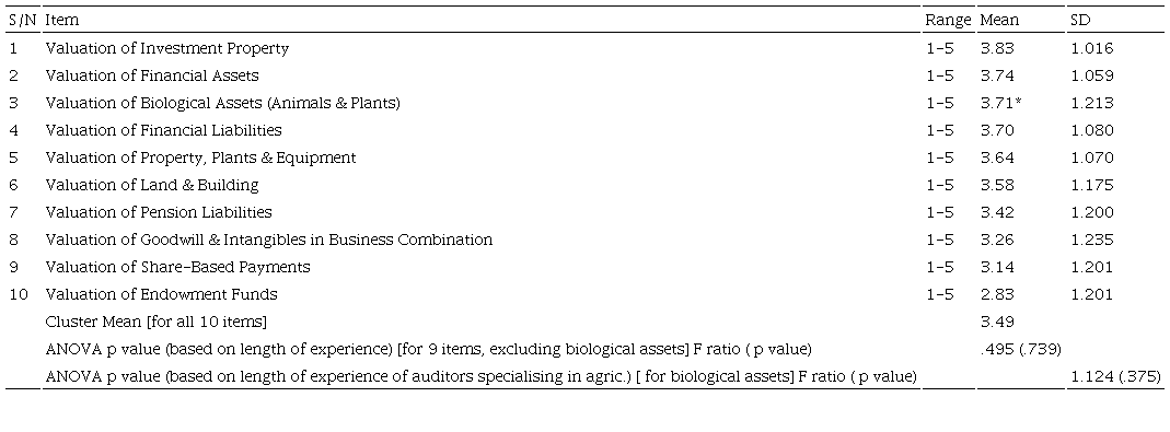 In sum, while tangible assets have higher application rate in comparison to some intangible items (such as pension liabilities, goodwill & intangibles acquired in business combination, share-based payments, and endowment funds), financial assets and financial liabilities are the two highest-ranking items among intangibles recording a moderate level of application. With a cluster Mean of 3.49 on a 5-point calibrated scale (equivalent to 69.8%) for the ten items in Table 3, the extent of application of fair value measurement by reporting entities in Nigeria is considered moderate. One-way ANOVA p value indicates no significant difference in the opinion of auditors (excluding biological assets, as this category of asset is peculiar to the agriculture/ agro-allied sector) based on their work experiences (p = .739 > .05). One-way ANOVA p value also confirms no significant difference in the extent of application to biological assets in agriculture/agro-allied sector (p = .375 > .05).