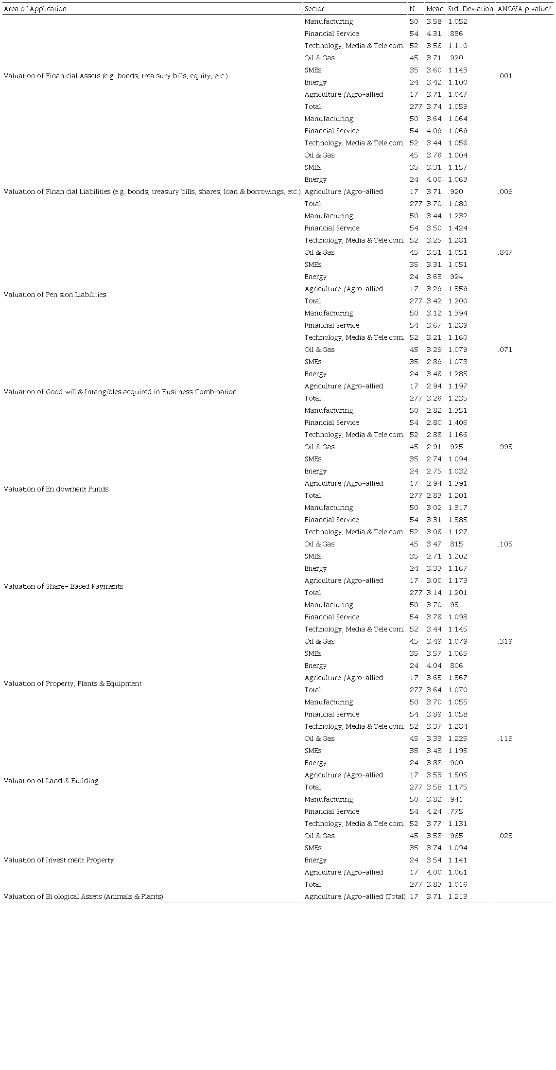 Application in the valuation of financial assets in the financial service sector has the highest rating (M = 4.31) and the consensus among respondents is strong in this regard (lowest dispersion (SD) of .886 in all the seven sectors) [Table 4]. This is followed closely by both the Oil & Gas (M = 3.71, SD = .921) and Agriculture /Agro-allied (M = 3.71, SD = 1.047) sectors, but with stronger consensus among auditors in the oil & gas sector (i.e. lower SD of .921). High level of application for reporting entities in the oil & gas sector may be because firms operating in this sector carry significant amount of financial assets (bonds, treasury bills, equity) and financial liabilities (bonds, treasury bills, shares, loan & borrowings) to finance their capital-intensive operations. Manufacturing firms (M = 3.58) and Technology, Media & Telecommunication firms (M = 3.56) have moderate application rate, with Mean scores above 3.50. The Energy sector (M = 3.42) has a moderate ranking in the extent of application. The application rate with respect to financial assets is moderate for firms in financial service, Oil & Gas, SMEs, Agriculture /Agro-allied, Manufacturing sectors and the Energy sector. The overall Mean score of 3.74 establishes that fair value estimate is moderately applied in the valuation of financial assets, but the extent of application significantly differs across sectors (p = .001 < .05).
