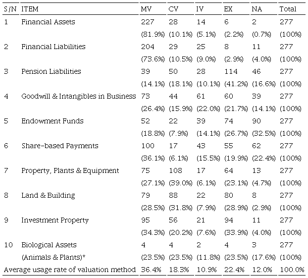 To recapitulate, the number of unclassified cases for the valuation of property, plants & equipment, land & building, and investment property is low. This contrasts sharply with the high number under valuation of intangible assets and liabilities (except financial assets and liabilities) in which respondents were unable to ascribe valuation methods to items. This result underscores the observation that fair value measurement is applied more to tangible assets than intangible assets/liabilities. The observation that financial assets and financial liabilities have the least incidence of unclassified cases among intangible items only reinforces the sub-mission that the level of application for financial instruments is higher than others. However, the unclassified cases for valuation methods reveal some grey areas in the application of fair value accounting in Nigeria, especially in connection with the valuation of intangible items.