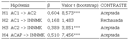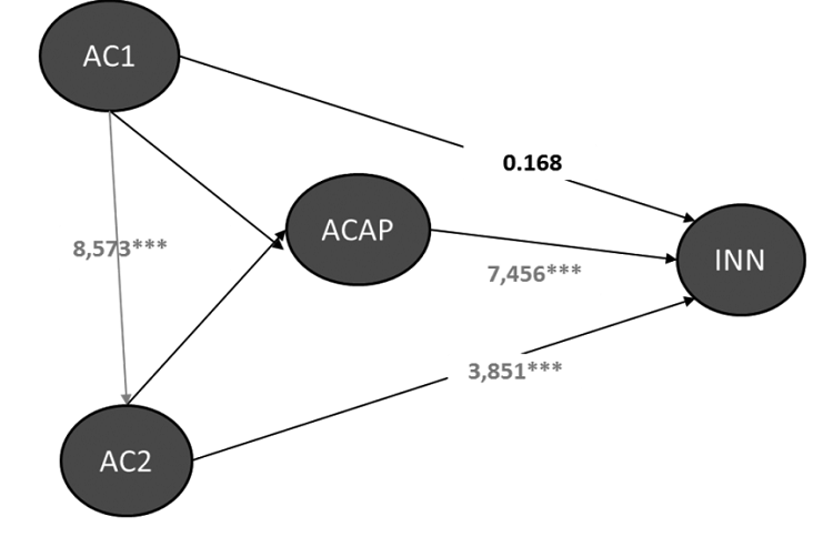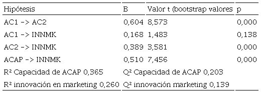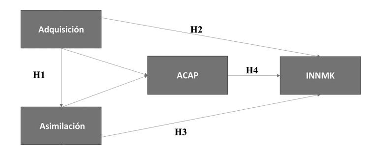 Por lo tanto, las empresas deben analizar e interpretar constantemente las demandas cambiantes del mercado y comprender rápidamente las nuevas oportunidades para traducirlas en productos y servicios competitivos orientados hacia la innovación en marketing, fundamentado que Corral de Zubielqui y col, (2016) demuestran que la ACAP tiene una influencia directa y positiva en los resultados de innovación, que se relacionan con las capacidades de marketing. Esta afirmación da origen a la siguiente hipótesis. H4: La capacidad de absorción potencial del conocimiento externo (CAP) tiene un efecto sobre la innovación en marketing (INN).