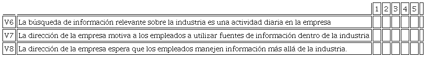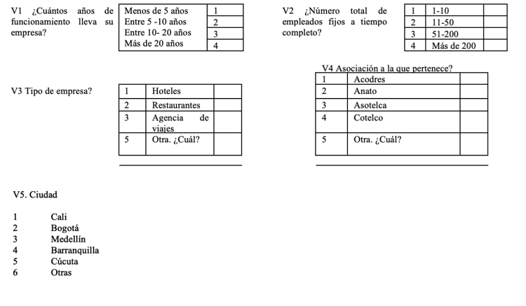 Con respeto a los ítems de las encuestas, estos fueron adoptados de Flatten, Engelen, Zahra y Brettel, (2011) quienes cuentan con una escala aceptada en la literatura de la Capacidad de absorción del conocimiento, y que para el caso de la capacidad de absorción potencial se midieron según las dimensiones adquisición y asimilación (Tabla 1, V6-V12). Por otro lado, mediante la clasificación de los tipos de innovación del Manual de Oslo se tomó la innovación en Marketing o en comercialización aplicando la escala de medición de Camisón (2005), tal como se muestra en la Tabla 1, (V13-V19). En los dos casos, las escalas de los ítems, fueron adaptados al contexto colombiano según los resultados de la prueba piloto aplicada.