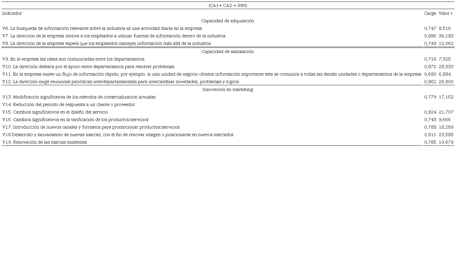 Por lo tanto, el nivel de colaboración con diferentes stakeholders puede mejorar las capacidades de innovación de las empresas solo si los gerentes de las mismas han desarrollado la capacidad de escanear y adquirir conocimiento externo (Najafi-Tavani, et al. 2018). De tal forma que, Berkhout y Col. (2010) determinan el desarrollo y la difusión de nuevos productos innovadores provienen generalmente, de ideas relacionadas con la comprensión de los clientes potenciales y sus necesidades de marketing. Por lo anterior se expone la siguiente hipótesis. H2: La adquisición de conocimiento externo (CA1) tiene un efecto sobre la innovación en marketing (INN).