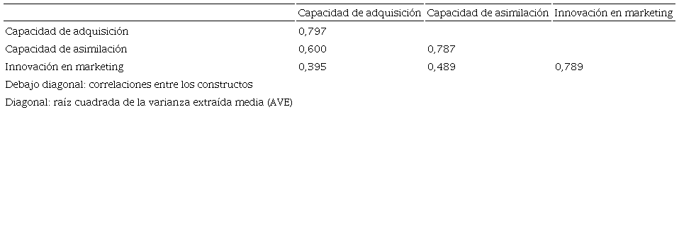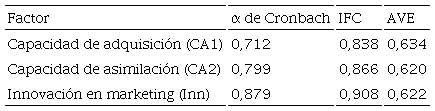Para el análisis del modelo de medida en el proceso de depuración de los resultados del análisis de la fiabilidad individual del ítem, se mantuvieron aquellas cargas superiores a 0.7; y se eliminaron por el contrario los ítems inferiores a 0,6, que, para todos los casos valorados, se presentó un solo ítem perteneciente a la escala que mide el grado de innovación en marketing (V34). Los resultados revelaron que son significativas todas las cargas de los ítems sobre su factor pronosticado (p<0,01) y que sus cargas estandarizadas son mayores de 0,6 (Bagozzi y Yi, 1988), siendo el promedio de las mismas superior a 0,7 (Hair, Black, Babin, Anderson y Tatham, 2005). Por lo anterior, se puedo afirmar que los ítems analizados evidencian la significancia en la fiabilidad individual de las diferentes escalas evaluadas: Adquisición, asimilación e Innovación en Marketing (Tabla 2 y 3).
