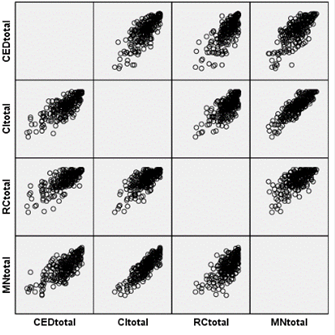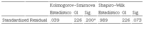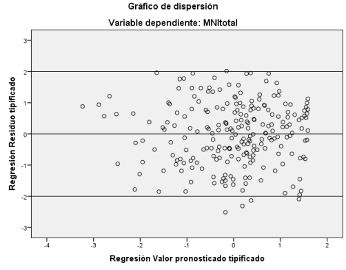 Hair, Anderson, Tatham y Black (2007) mencionan cuatro supuestos a probar en la regresión múltiple que son las siguientes: (a) linealidad del fenómeno, (b) normalidad de los residuos, (c) independencia de los términos de error y (d) varianza constante del término de error (homocedasticidad). Para esta investigación, el primer criterio que se analizó fue el de linealidad de cada variable independiente con la variable criterio y se observó en los gráficos de dispersión que existe una relación positiva y los puntos tienden a ser una línea recta (ver Figura 2). El segundo criterio que se probó fue la normalidad de los errores utilizando el estadístico de Kolmogorov-Smirnov (p > .05); se eliminaron siete datos atípicos y se probó que la distribución de los residuos es normal (p = .200) (ver Tabla 2). En el tercer criterio se probó la independencia de los errores, utilizando la prueba de Durbin-Watson cuyo valor fue de DW = 1.970 el cual está muy próximo a dos; esto indica que los errores no están correlacionados y son independientes (ver Tabla 3). Por último, se analizó la homocedasticidad, utilizando el gráfico del valor predicho estandarizado y el valor del residuo estandarizado; se observó que no hay relación lineal en los residuos y, por lo tanto, los errores tienen varianzas iguales (ver Figura 3).