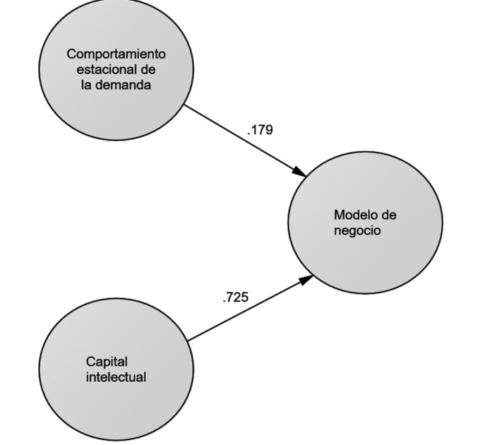 En la Figura 4 se muestran los coeficientes estandarizados para comportamiento estacional de la demanda B igual a .179 y el capital intelectual B igual .725. También se analizó la colinealidad de los constructos y se observó que el factor de la inflación de la varianza de comportamiento estacional de la demanda y capital intelectual fue menor que diez (FIV = 2.558), por lo cual, se concluye que los constructos modelo de negocio y comportamiento estacional de la demanda no presentan colinealidad.