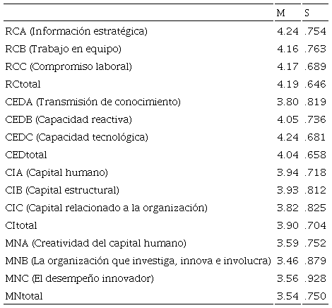 Para profundizar en el estudio sobre cómo los directivos trabajan de manera práctica las variables en estudio, se obtuvieron las medias aritméticas de las dimensiones (ver Tabla 1), en donde se puede observar que la dimensión más baja en relaciones de colaboración es trabajo en equipo (RCB) y, la más alta, información estratégica (RCA). Para la variable competencia estacional de la demanda la dimensión más baja es transmisión de conocimiento (CEDA), la más alta fue capacidad tecnológica (CEDC). Para capital intelectual la dimensión más baja es capital relacionado a la organización (CIC) y, la más alta, capital humano (CIA). Para modelo de negocio la más baja es la organización que investiga, innova e involucra. En el anexo se encuentran todas las medias aritméticas de las declaraciones.