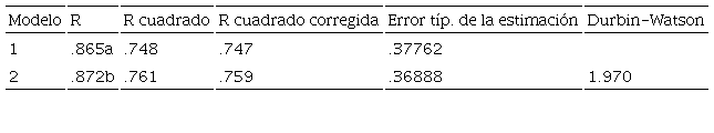 De igual manera, en el modelo 2 propuesto que se muestra en la Tabla 4 se obtuvo el valor F igual a 354.726 y el valor p igual a .000. Como el nivel de significación es menor a .05, se indica que existe una correlación lineal positiva y significativa. Con base en lo anterior, se rechaza la hipótesis nula.