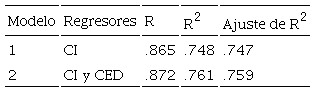 Los valores del coeficiente no estandarizado Bk, obtenidos mediante la técnica estadística de regresión, fueron los siguientes: B0 igual a -.300, B1 no significativo, B2 igual .205 y B3 igual a .772. Con dichos valores se pudo construir la siguiente ecuación de regresión, utilizando el método de mínimos cuadrados: