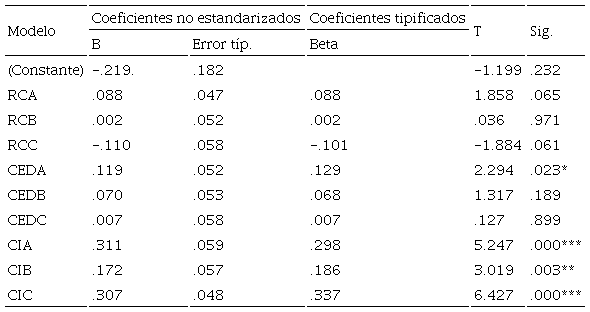 En la Tabla 5 se analizaron las dimensiones de cada constructo que mejor explican el modelo de negocio encontrándose que CIC (Capital relacionado a la organización), CIA (Capital humano), CIB (Capital estructural) y CEDA (Transmisión de conocimiento) son las dimensiones que explican significativamente a la variable modelo de negocio.