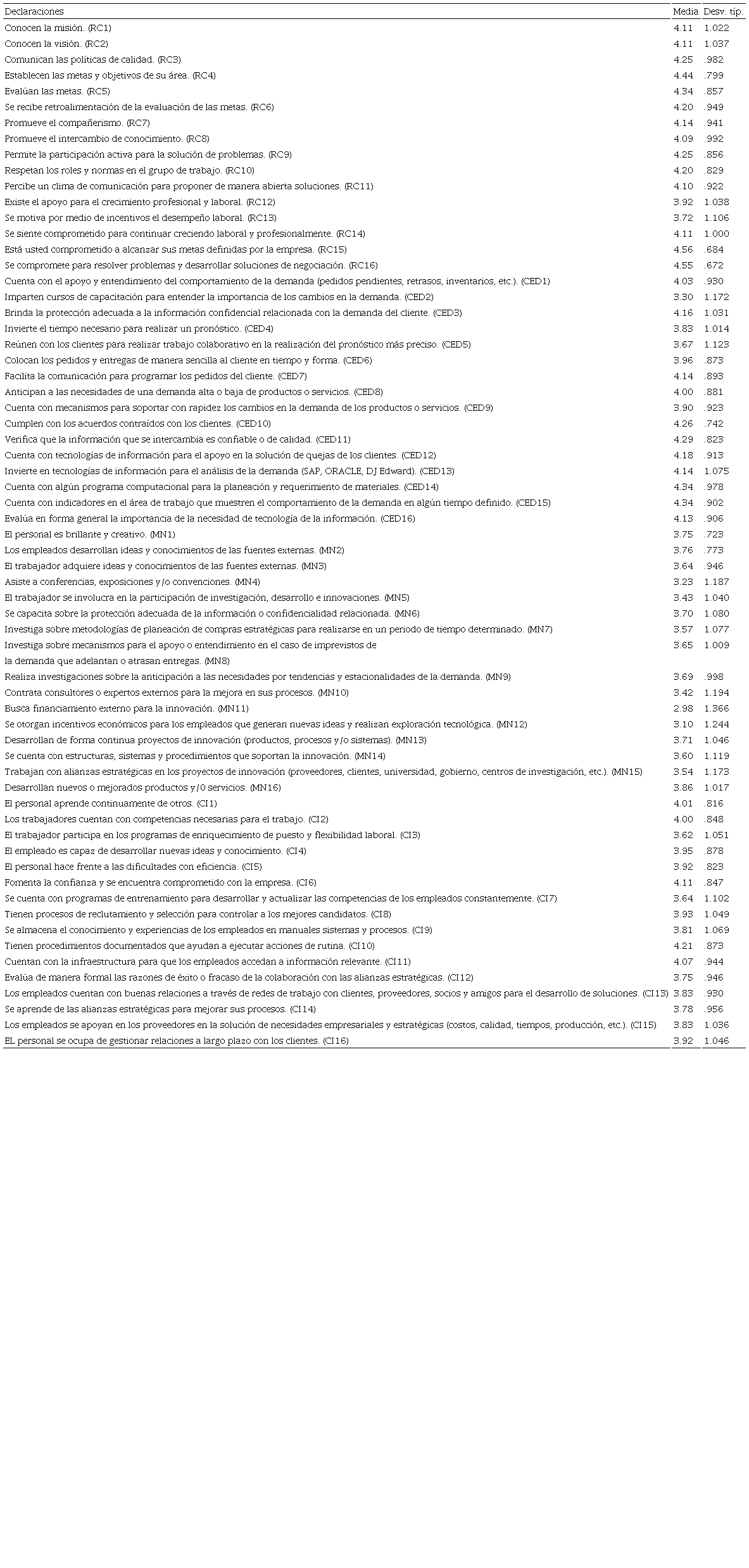 La confiabilidad del instrumento se midió por variable con su correspondiente alfa de Cronbach: (a) relaciones de colaboración, .936, (b) comportamiento estacional de la demanda, .930, (c) capital intelectual, .934 y (d) modelo de negocio, .934.