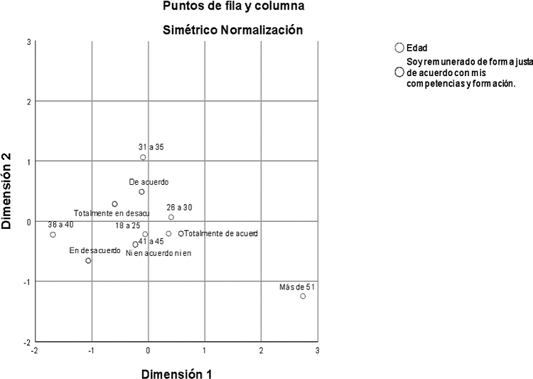 El resultado obtenido y evidenciado en la Tabla 4 demuestra que entre la edad del cliente interno de las organizaciones estudiadas, y su perspectiva frente a la justa remuneración en la empresa existe un nivel de explicación de los datos sobre dos dimensiones con una inercia del 88.0% en términos de análisis de correspondencias simples en reducción de dimensiones. Así mismo, desde lo visualizado en la Figura 1 los empleados con edades entre los 18 a 30 años están totalmente de acuerdo con afirmar que son remunerados de forma justa de acuerdo con sus competencias y formación. Los de 31 a 35 años están de acuerdo con la misma afirmación, mientras que las personas con edades entre los 36 a 40 años manifiestan su desacuerdo con esta afirmación. Los colaboradores con edades entre los 41 a los 45 años aseveran respecto a dicha afirmación no estar ni de acuerdo ni en desacuerdo.