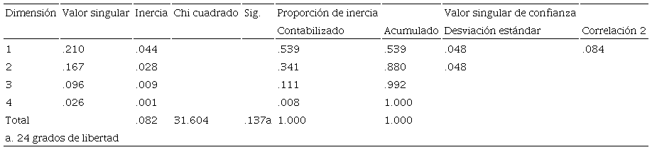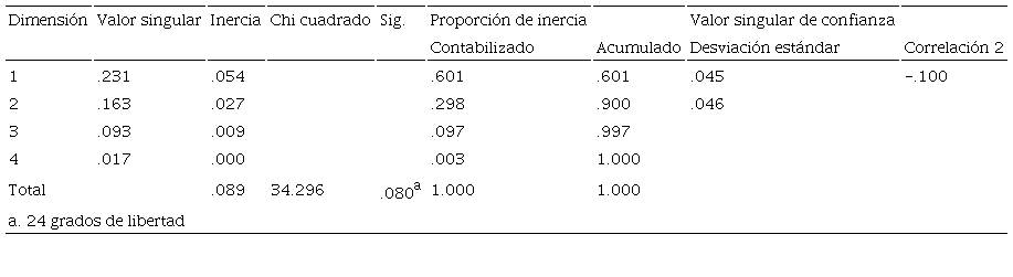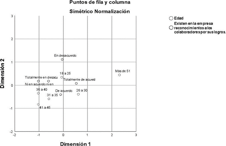 La Tabla 5 muestra que entre la edad de los empleados, y su perspectiva frente a la existencia de reconocimientos a colaboradores en la empresa existe un nivel de explicación de los datos sobre dos dimensiones con una inercia del 90.0% en términos de análisis de correspondencias simples en reducción de dimensiones. Los colaboradores con edades entre los 26 a 30 años están totalmente de acuerdo con afirmar que existen en la empresa reconocimientos por sus logros, a diferencia del cliente interno con edades entre los 36 a 40 quienes están totalmente en desacuerdo. Los empleados con edades entre los 31 a 35 años están de acuerdo con esta afirmación; lo anterior reflejado en la Figura 2.