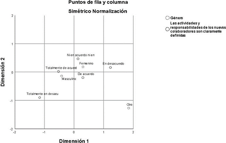 Se observa que entre el género de los nuevos colaboradores y la identificación de sus responsabilidades al vincularse laboralmente existe un nivel de explicación de los datos sobre dos dimensiones con una inercia del 100.0% en términos de análisis de correspondencias simples en reducción de dimensiones, esto de acuerdo a la Tabla 6. Así mismo, la Figura 3 describe que los colaboradores de género masculino están totalmente de acuerdo con afirmar que las actividades y responsabilidades de los nuevos colaboradores son claramente definidas; mientras que el género femenino no está ni de acuerdo ni en desacuerdo con esta afirmación.