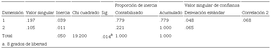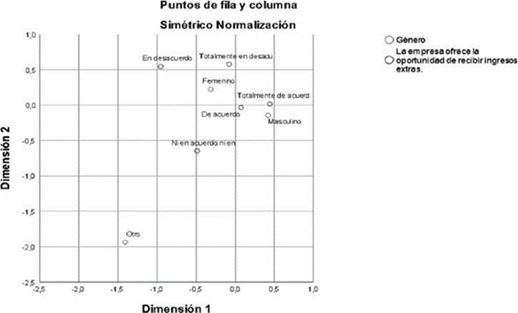 La Tabla 7 determina que entre el género del cliente interno y su perspectiva frente a la oportunidad de recibir ingresos extras en las empresas existe un nivel de explicación de los datos sobre dos dimensiones con una inercia del 100.0% en términos de análisis de correspondencias simples en reducción de dimensiones. En la Figura 4 se evidencia que los colaboradores de género masculino están totalmente de acuerdo con afirmar que la empresa ofrece la oportunidad de recibir ingresos extras, contrario a lo manifestado por el género femenino que revela que ante dicha afirmación está totalmente en desacuerdo.