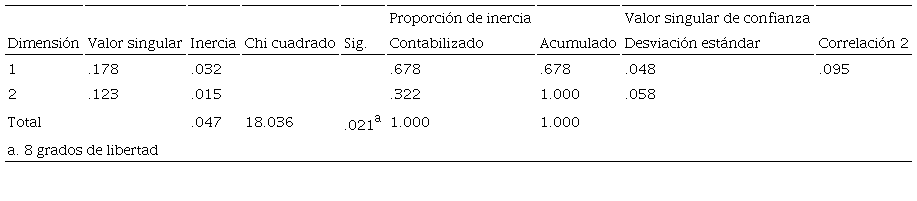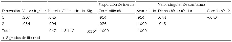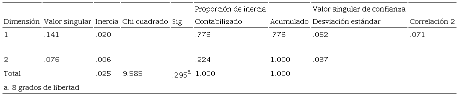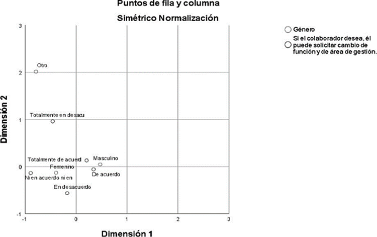 Se observa que entre el género de los colaboradores y la posibilidad de solicitar cambio de labores en la empresa existe un nivel de explicación de los datos sobre dos dimensiones con una inercia del 100.0% en términos de análisis de correspondencias simples en reducción de dimensiones, esto de acuerdo a la Tabla 8. Así mismo, la Figura 5 puntualiza que los colaboradores de género masculino están de acuerdo con afirmar que, si el colaborador desea, él puede solicitar cambio de funciones, así como de área de gestión; por el contrario, el género femenino está en desacuerdo con esto.